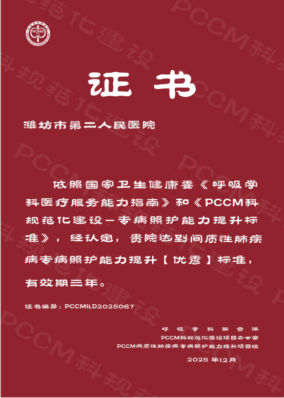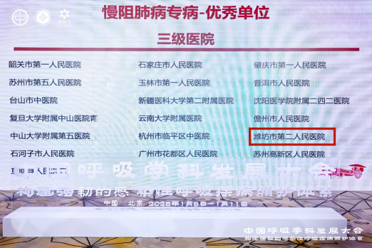 1月10日至11日,2026年中国呼吸学科发展大会在北京举行。会上根据2025年PCCM科规范化建设3.0版评审标准,公布了2025年度PCCM(呼吸与危重症医学)5个专病的照护能力认定结果,潍坊市第二人民医院(潍坊市呼吸病医院)凭借在呼吸领域的深厚积淀和扎实实践,在“肺癌与肺结节专病照护能力”“肺炎专病照护能力”“哮喘专病照护能力”3个项目获评“示范单位”,“慢阻肺病专病照护能力”“间质性肺疾病专病照护能力”2个项目获评“优秀单位”。这一成绩的取得,不仅是对医院呼吸学科综合实力的高度认可,更标志着医院的呼吸健康照护体系建设迈上新台阶。